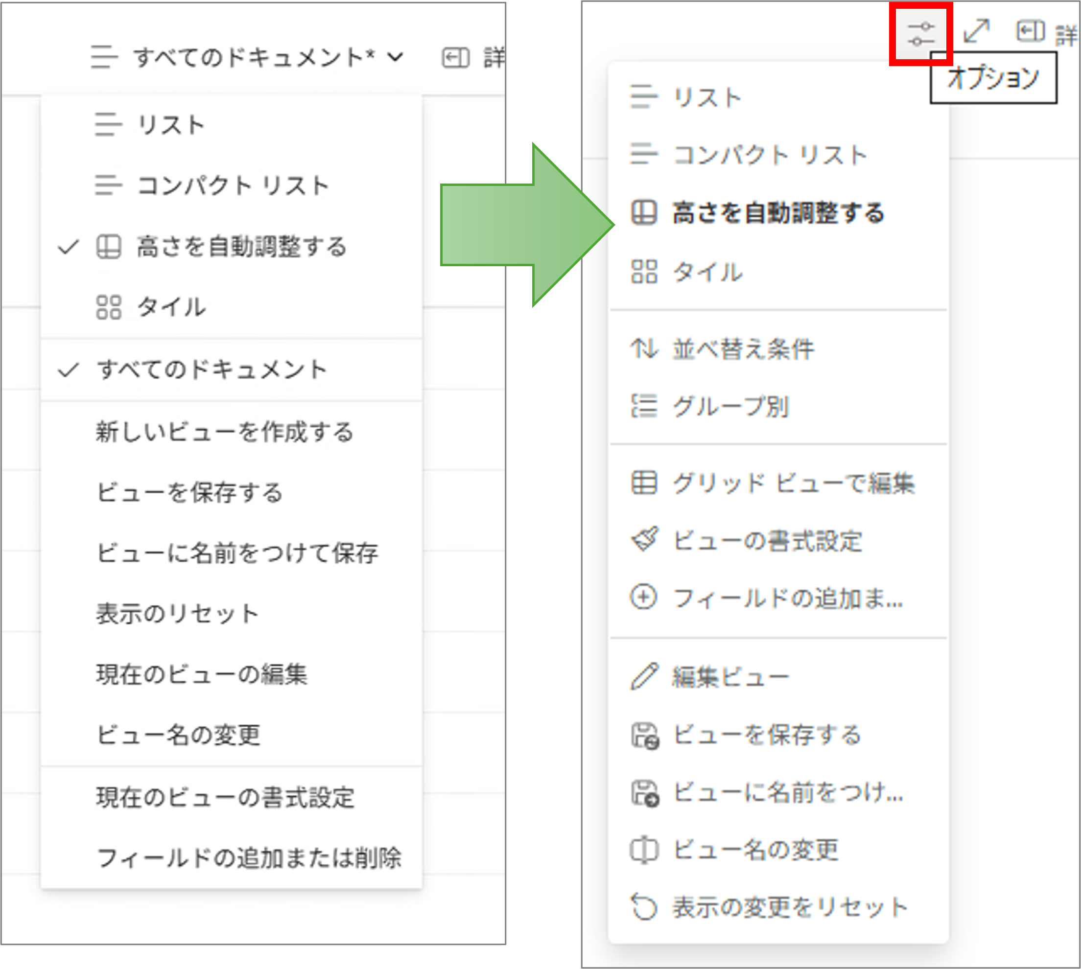 新たに追加された[オプション]ボタンのメニューから選択できます。