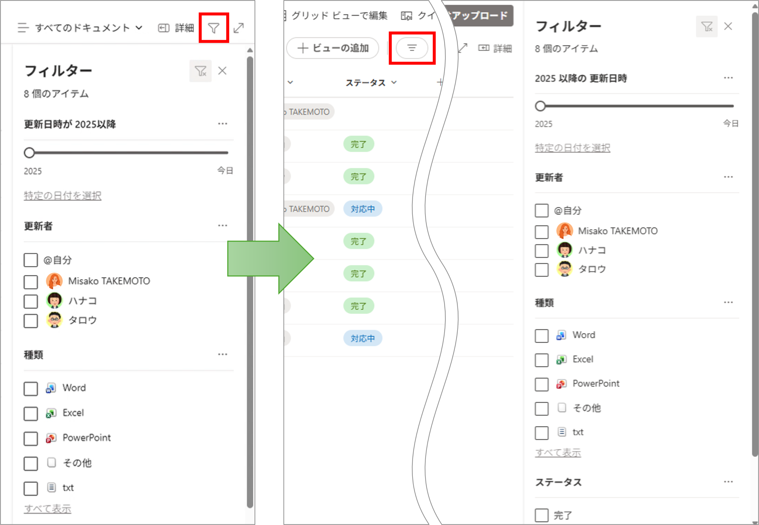 同じく右上にあった「フィルター」ボタンは、[+ビューの追加]の右横に移動しました。